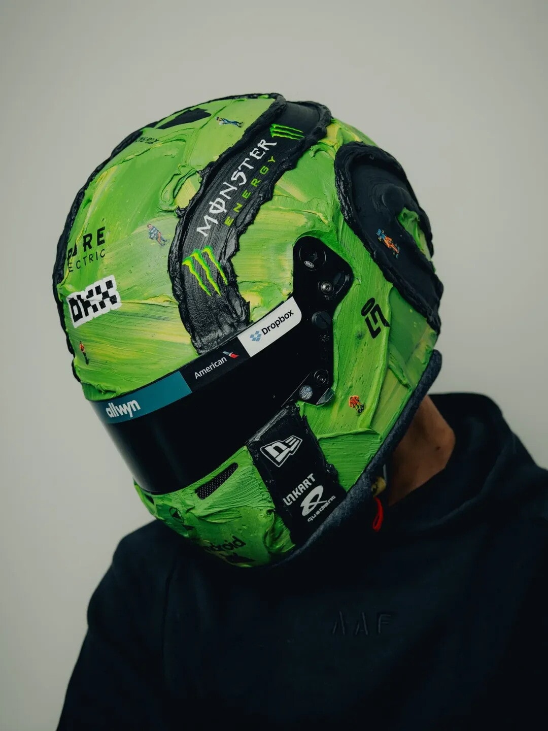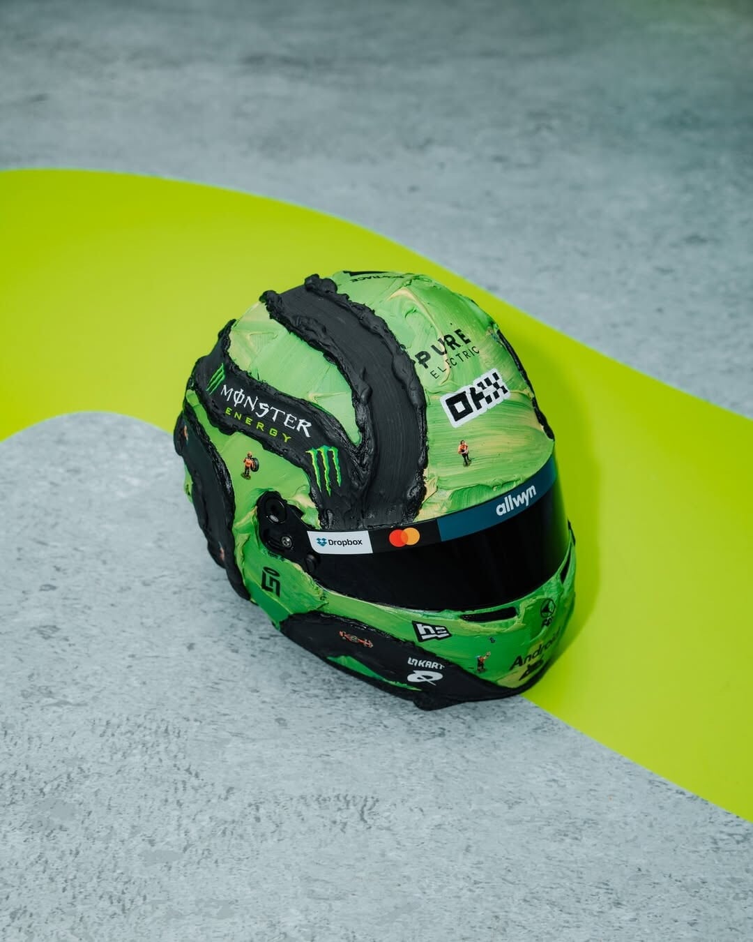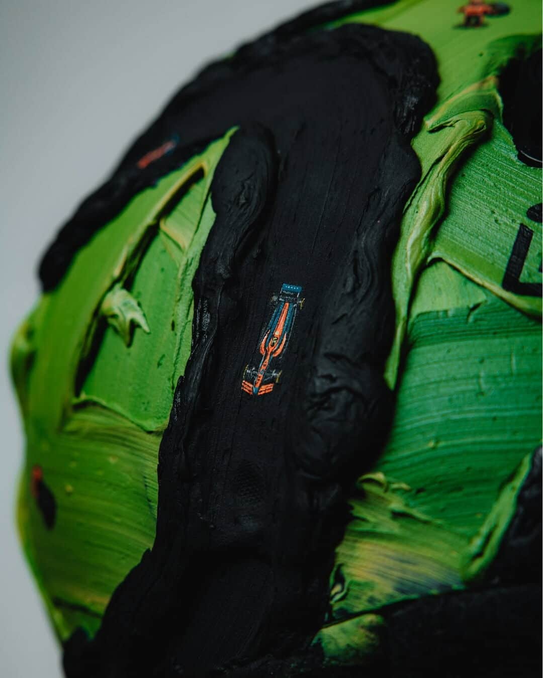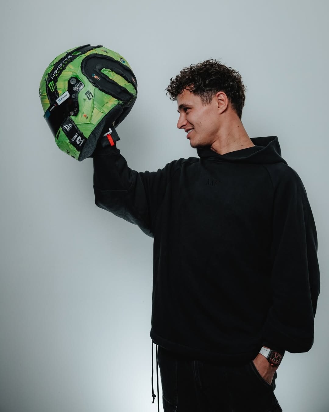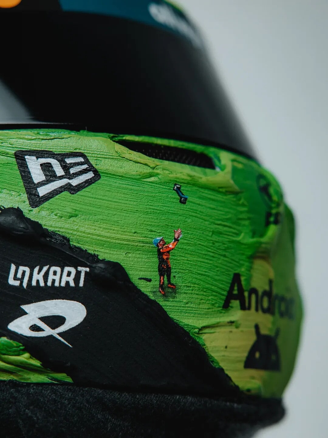 Il leader del mondiale toccherà quota 150 Gran Premi in carriera proprio nel weekend di Las Vegas. Per festeggiare il traguardo, Norris ha collaborato con l’artista Werner Bronkhorst per realizzare un casco speciale. Bronkhorst, sudafricano, è noto per un approccio creativo unico: da un lato fondi scultorei astratti su cui inserisce figure e oggetti in miniatura dipinti in stile iperrealista; dall’altro disegni a carboncino di automobili arricchiti da testi spessi sovrapposti. Un mix che si presta perfettamente per un casco celebrativo.