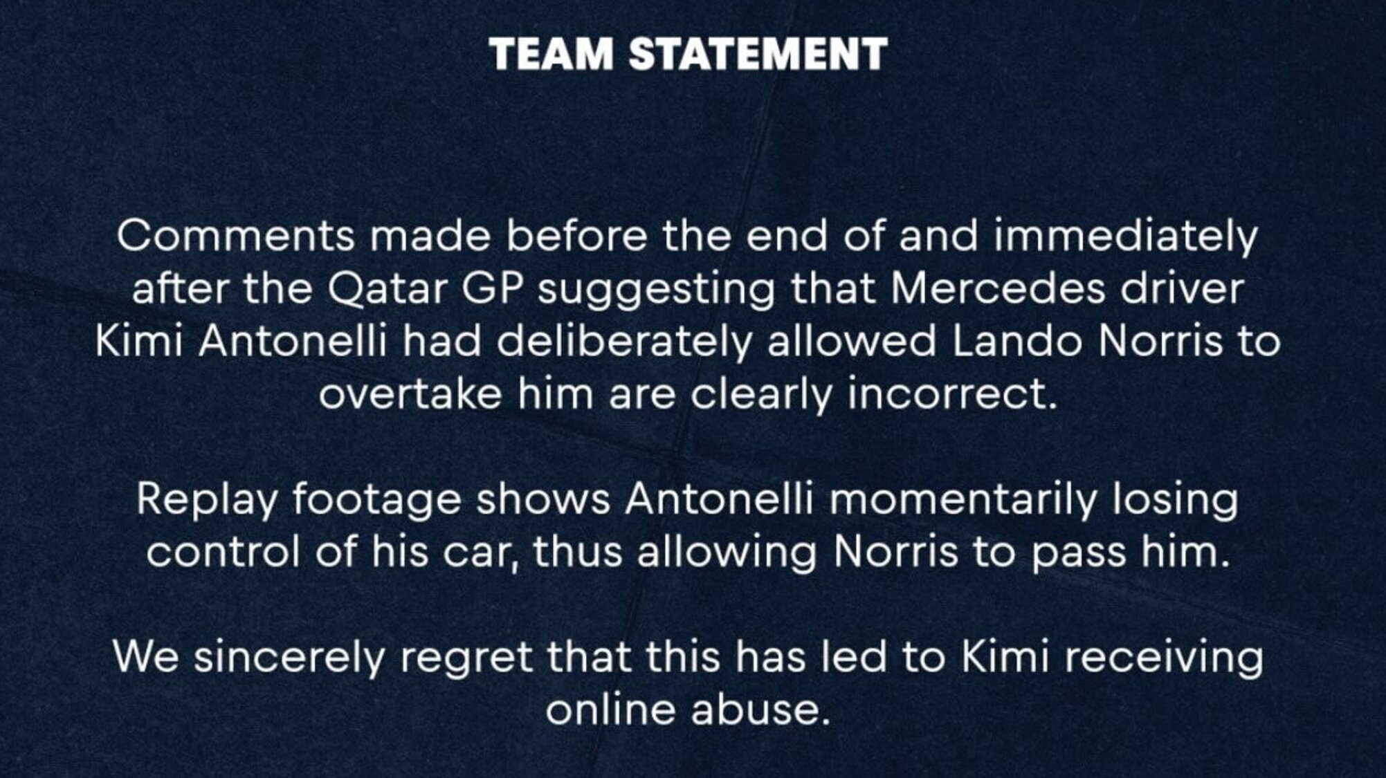 "I commenti fatti prima della fine e subito dopo il GP del Qatar, secondo cui il pilota Mercedes Kimi Antonelli avrebbe deliberatamente lasciato passare Lando Norris, sono chiaramente errati.