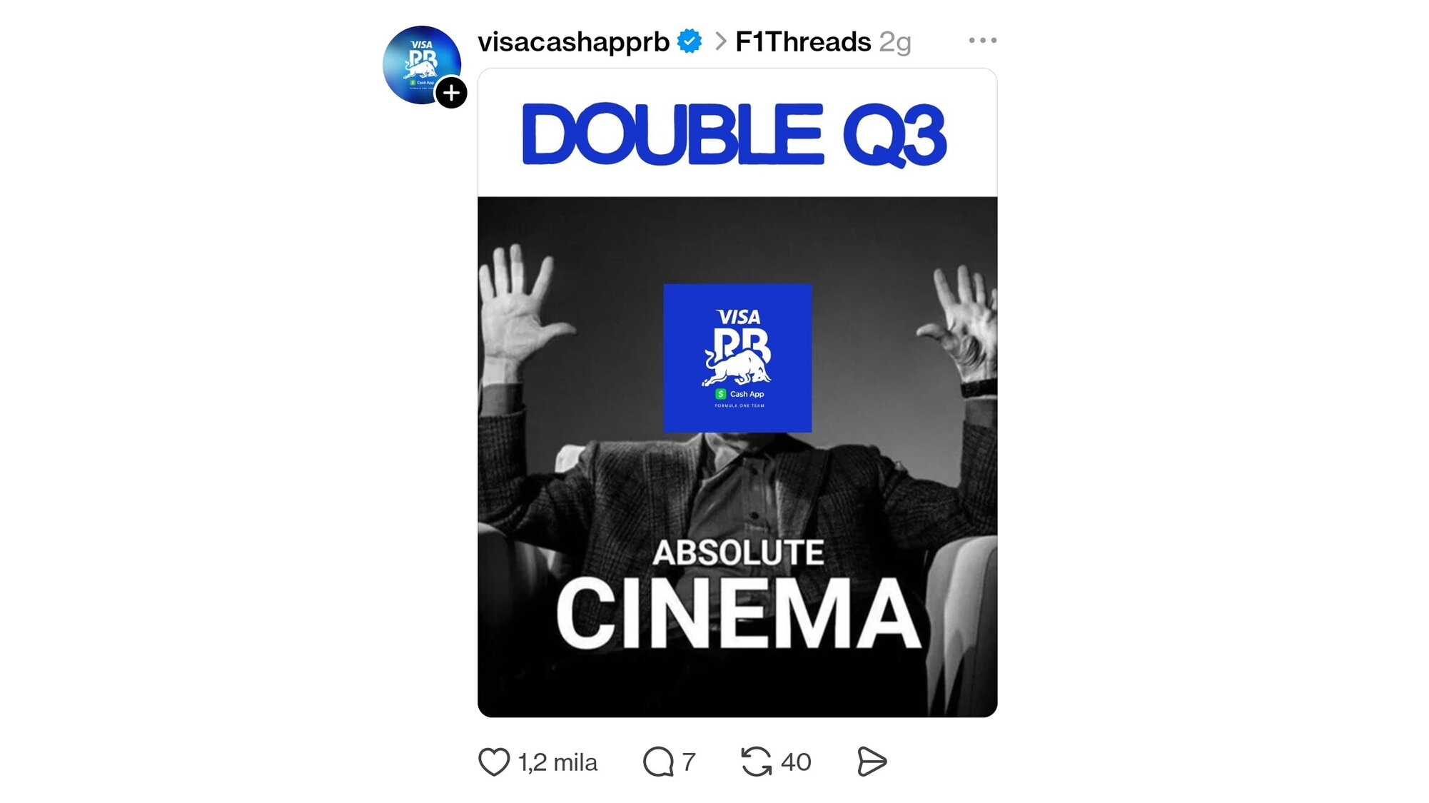 Il profilo ufficiale di X della Visa Cashapp ha pubblicato, subito dopo le qualifiche, il meme "absolute cinema". Si tratta di un frame di una citazione di Martin Scorzese diventata iconica per indicare qualcosa di spettacolare, in particolar mondo nello sport. In questo caso, si voleva sottolineare il risultato notevole di Liam Lawson e Isack Hajdar, rispettivmente ottavo e quarto, quindi entrambi in Q3.